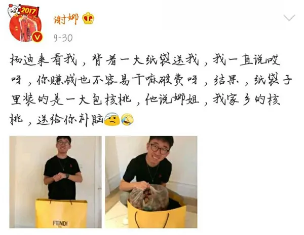 記得最初謝娜發微博說楊迪給她買了29.9的桃沒買9.9的桃,還給她送了四川涼拌雞,最讓人印象深刻的是給她帶了用FENDI大紙袋裝的郵費比核桃本身還貴的核桃,也是讓娜娜誤會一把,以為楊迪破費了麼。楊迪可真是一個實在人~