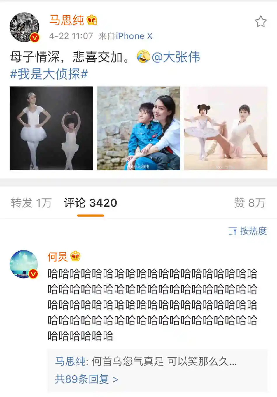 近日,馬思純微博發佈了自己和大張偉的ps“母子”照,並配文“母子情深,悲喜交加”。照片一發出,便引來網友圍觀:“這圖毫無ps痕跡,馬思純太會玩了!”“馬大哈大馬哈組合太可愛!”更有網友發現,原圖是霍思燕與兒子嗯哼的合照,看到馬思純如此惡搞大張偉,就連何炅也忍不住爆笑,馬思純更是調皮迴應何老師:“您氣真足,可以笑這麼久……”機智可愛的小馬哥可以說是古靈精怪本怪了!
