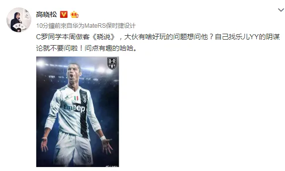 據瞭解, C羅此次來華還會參與優酷《曉說》的錄製,屆時將與高曉鬆暢談足球的奇聞趣事。對於此次節目錄制,高曉鬆也興奮微博發文稱:“C羅同學本週做客《曉說》,大夥有啥好玩的問題想問他?自己找樂兒YY的陰謀論就不要問啦!問點有趣的哈哈。”網友紛紛調侃:“最關心你倆誰帥!”“卡配羅女孩最關心的還是卡卡”,高曉鬆更是幽默迴應:“我有卡卡手機號,要不要現場連線?”看完評論真的感覺這屆網友有點皮!